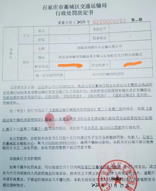 | 馆陶县鸿程汽车运输有限公司 | 法人及非法人组织 | 91130433MA08X5JRXB | 陈*祥 | 身份证 | 132135********1913 | 冀藳交罚【2022】0220000262 | 违反了《道路运输车辆技术管理规定》第二十条 | 冀D7A899货车道路运输经营者未按照规定的周期和频次进行车辆综合性能检测和技术等级评定的案 | 依据《道路运输车辆技术管理规定》第三十一条第三项和《河北省交通运输行政处罚自由裁量权执行标准》第五十八条第二项属于一般等级的规定 | 罚款 | 0.1 | 2022.11.17 | 藁城区交通运输局 | FA06-002-15 |