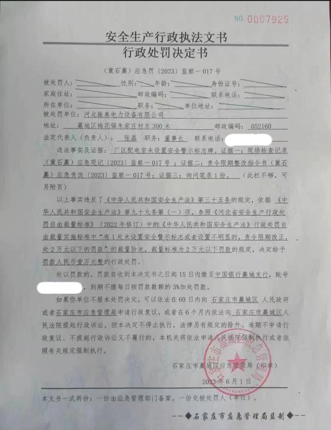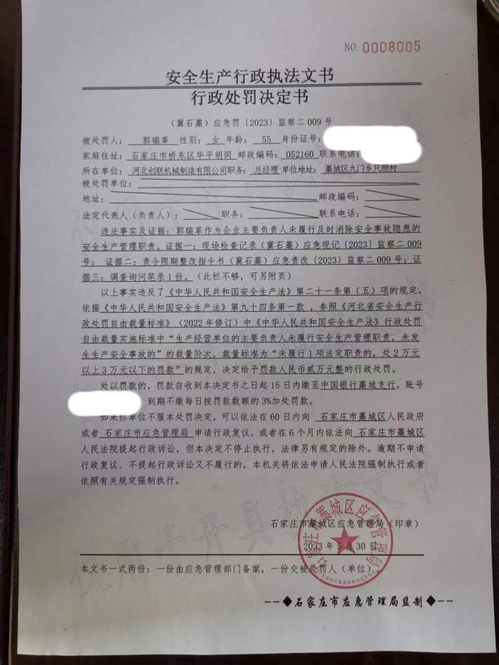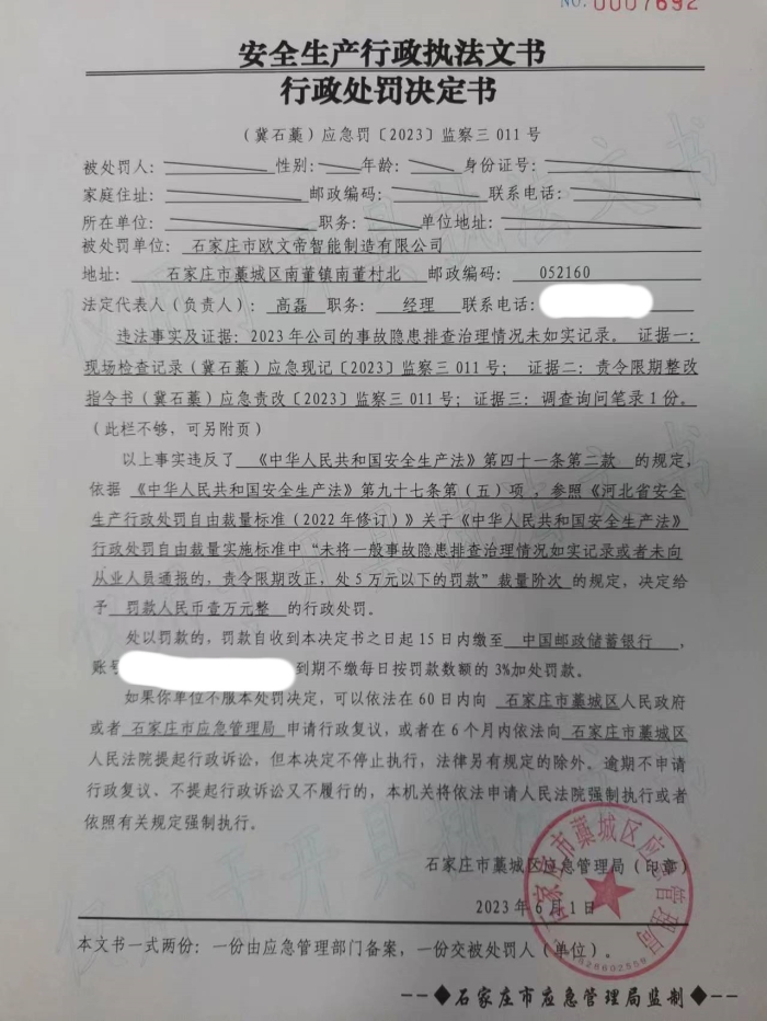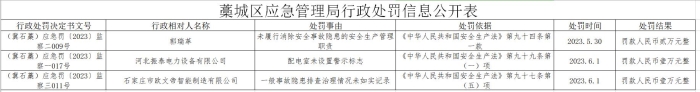 藁城区应急管理局行政处罚信息公开表(2023年6月5日)