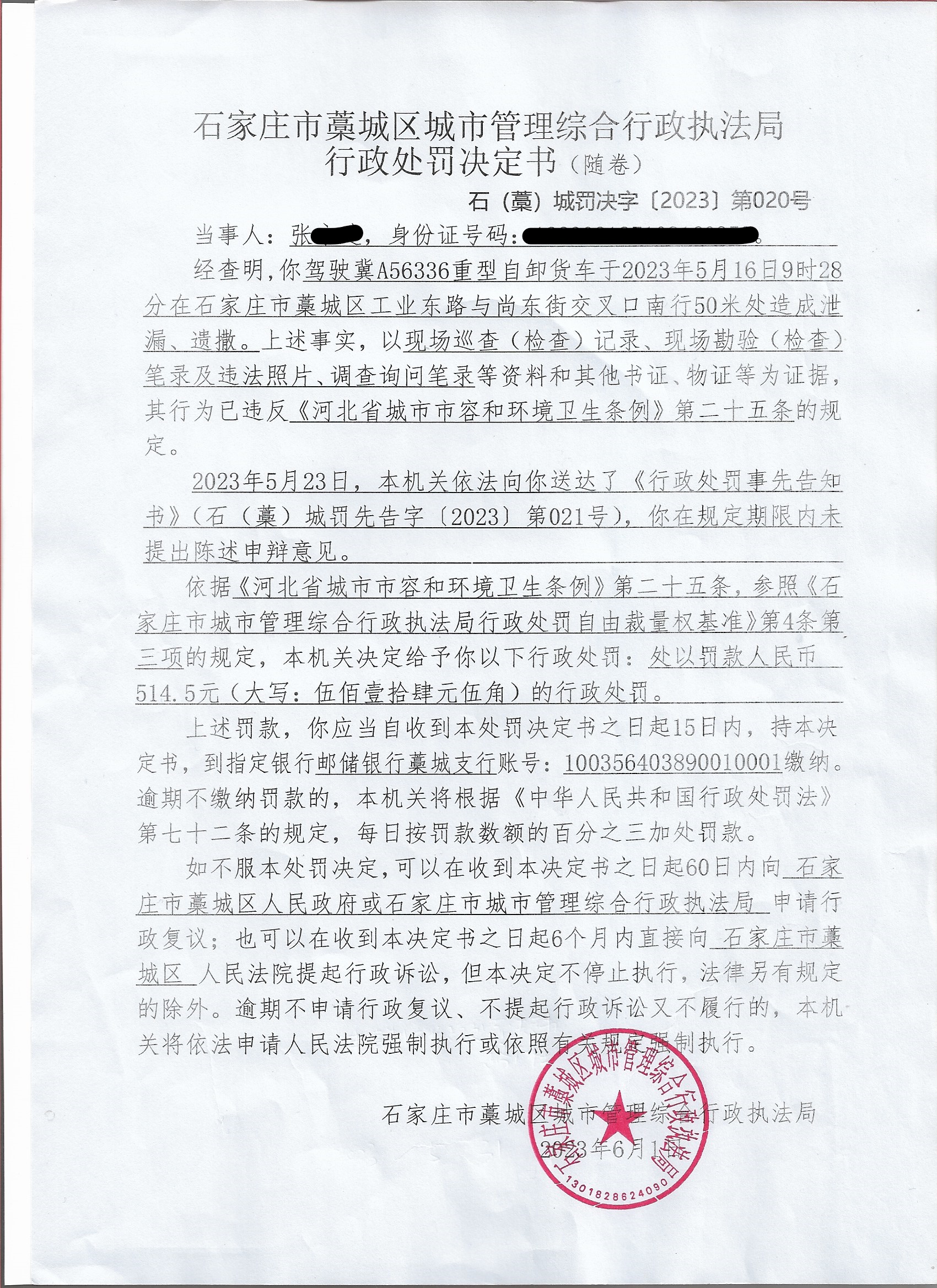 藁城区城市管理综合行政执法局行政处罚决定书020