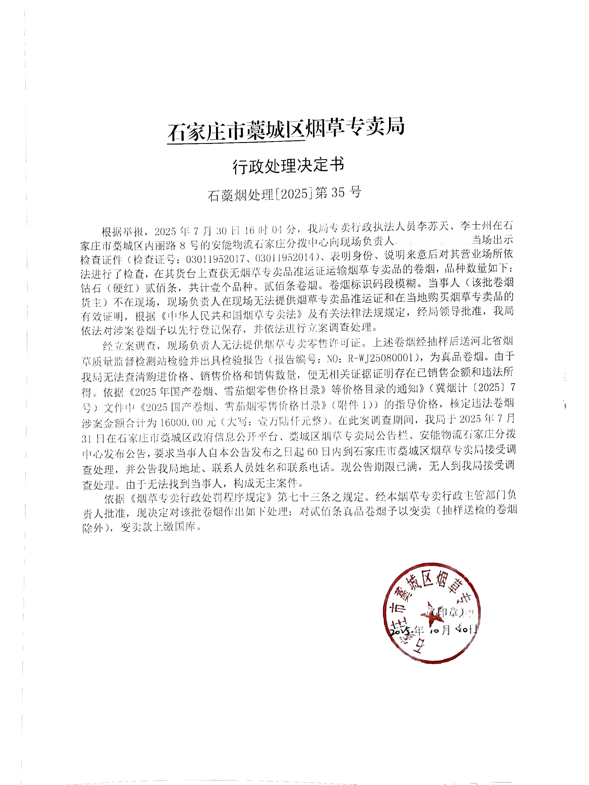 | 石藁烟处[2025]第35号 | 无主 | 无烟草专卖品准运证运输烟草专卖品 | 查获无主无烟草专卖品准运证运输烟草专卖品 | 《中华人民共和国烟草专卖法》第二十一条、《中华人民共和国烟草专卖法实施条例》第三十三条第二款 | 其他 | 《烟草专卖行政处罚程序规定》第七十三条之规定 | 予以变卖,变卖款上缴国库 | 2025年10月10日 | 行政处罚 | 石家庄市藁城区烟草专卖局 |
