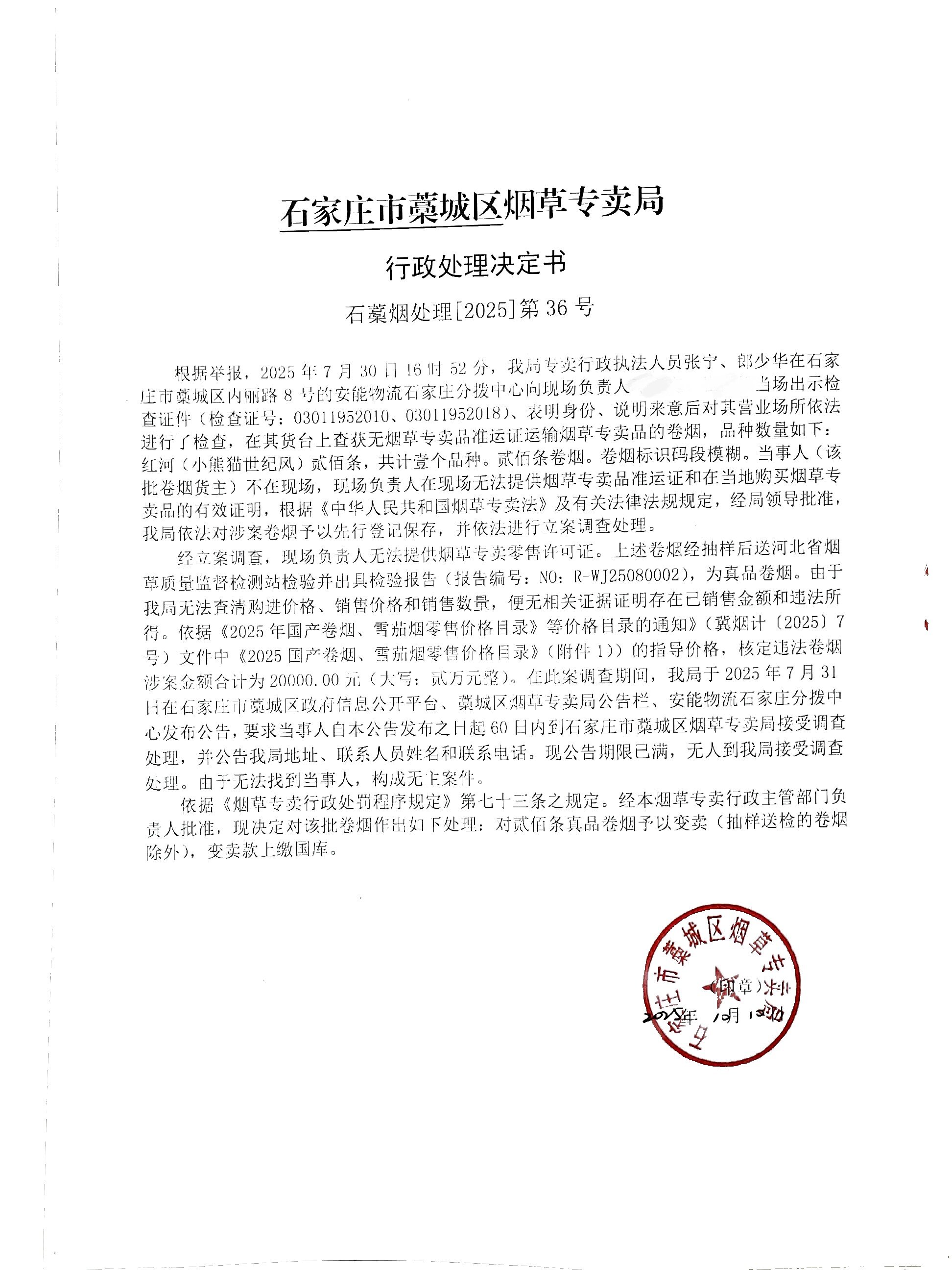 | 石藁烟处[2025]第36号 | 无主 | 无烟草专卖品准运证运输烟草专卖品 | 查获无主无烟草专卖品准运证运输烟草专卖品 | 《中华人民共和国烟草专卖法》第二十一条、《中华人民共和国烟草专卖法实施条例》第三十三条第二款 | 其他 | 《烟草专卖行政处罚程序规定》第七十三条之规定 | 予以变卖,变卖款上缴国库 | 2025年10月10日 | 行政处罚 | 石家庄市藁城区烟草专卖