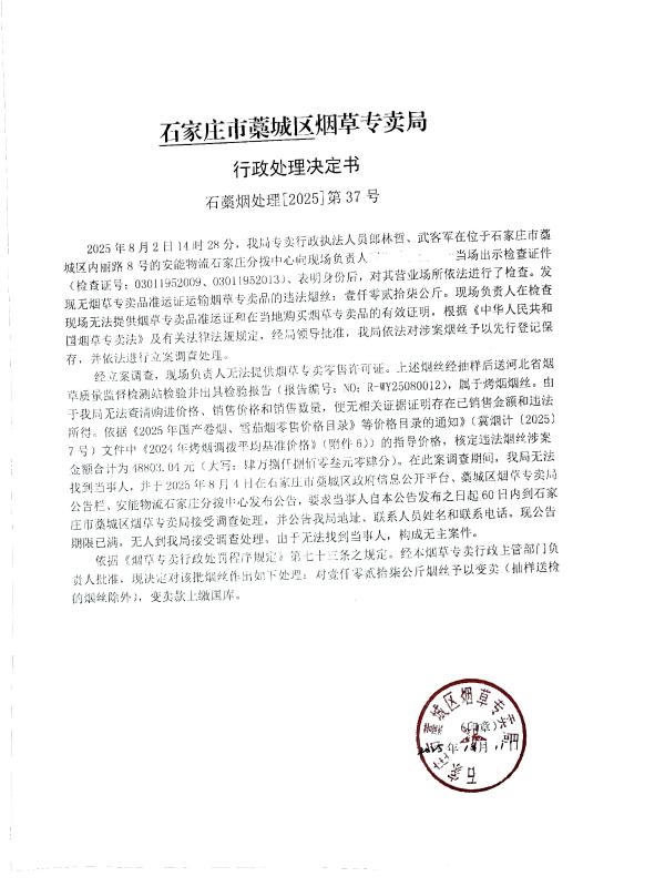 石藁烟处[2025]第37号 无主 无烟草专卖品准运证运输烟草专卖品 查获无主无烟草专卖品准运证运输烟草专卖品 《中华人民共和国烟草专卖法》第二十一条、《中华人民共和国烟草专卖法实施条例》第三十三条第二款 其他 《烟草专卖行政处罚程序规定》第七十三条之规定 予以变卖,变卖款上缴国库 2025年10月11日 行政处罚 石家庄市藁城区烟草专卖局