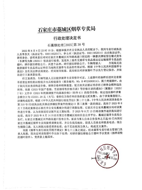 石藁烟处[2025]第38号 无主 无烟草专卖品准运证运输烟草专卖品 查获无主无烟草专卖品准运证运输烟草专卖品 《中华人民共和国烟草专卖法》第二十一条、《中华人民共和国烟草专卖法实施条例》第三十三条第二款 其他 《烟草专卖行政处罚程序规定》第七十三条之规定 予以变卖,变卖款上缴国库 2025年10月11日 行政处罚 石家庄市藁城区烟草专卖局