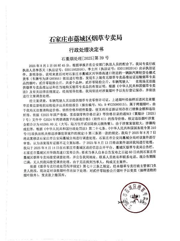 石藁烟处[2025]第39号 无主 无烟草专卖品准运证运输烟草专卖品 查获无主无烟草专卖品准运证运输烟草专卖品 《中华人民共和国烟草专卖法》第二十一条、《中华人民共和国烟草专卖法实施条例》第三十三条第二款 其他 《烟草专卖行政处罚程序规定》第七十三条之规定 予以变卖,变卖款上缴国库 2025年10月16日 行政处罚 石家庄市藁城区烟草专卖局