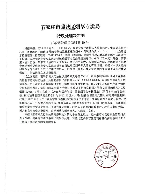 石藁烟处[2025]第40号 无主 无烟草专卖品准运证运输烟草专卖品 查获无主无烟草专卖品准运证运输烟草专卖品 《中华人民共和国烟草专卖法》第二十一条、《中华人民共和国烟草专卖法实施条例》第三十三条第二款 其他 《烟草专卖行政处罚程序规定》第七十三条之规定 予以变卖,变卖款上缴国库 2025年10月11日 行政处罚 石家庄市藁城区烟草专卖局