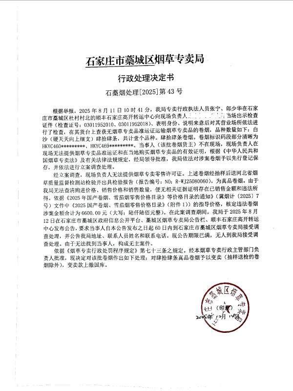 石藁烟处[2025]第43号 无主 无烟草专卖品准运证运输烟草专卖品 查获无主无烟草专卖品准运证运输烟草专卖品 《中华人民共和国烟草专卖法》第二十一条、《中华人民共和国烟草专卖法实施条例》第三十三条第二款 其他 《烟草专卖行政处罚程序规定》第七十三条之规定 予以变卖,变卖款上缴国库 2025年10月14日 行政处罚 石家庄市藁城区烟草专卖局