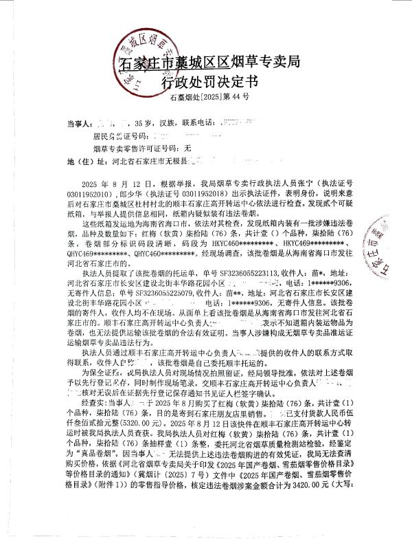 石藁烟处[2025]第44号 高* 无烟草专卖品准运证运输烟草专卖品 查获高*无烟草专卖品准运证运输烟草专卖品 《中华人民共和国烟草专卖法》第二十一条、《中华人民共和国烟草专卖法实施条例》第三十三条第二款 罚款 《中华人民共和国烟草专卖法》第二十一条、《中华人民共和国烟草专卖法实施条例》第三十三条第二款 罚款855.00元 2025年10月13日 行政处罚 石家庄市藁城区烟草专卖局