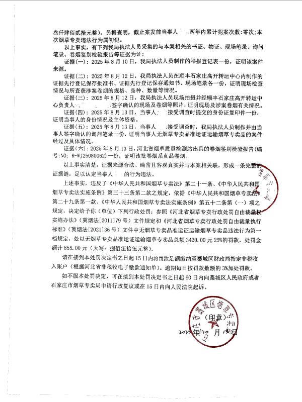 藁城区烟草专卖局2025年10月第2周行政处罚案件公示