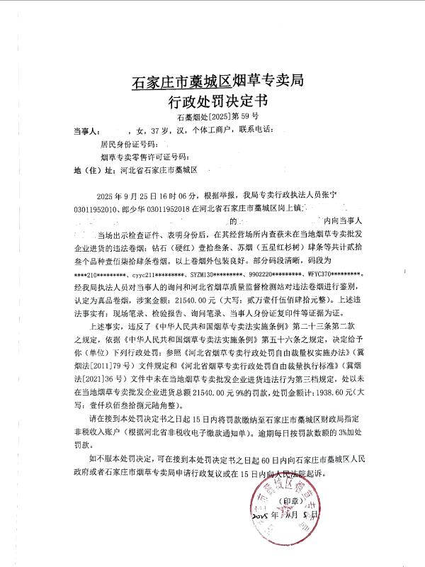 藁城区烟草专卖局2025年11月第1周行政处罚案件公示