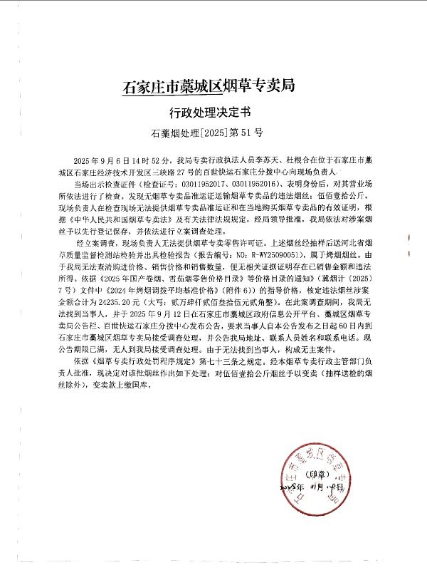 | 石藁烟处[2025]第51号 | 无主 | 无烟草专卖品准运证运输烟草专卖品 | 查获无主无烟草专卖品准运证运输烟草专卖品 | 《中华人民共和国烟草专卖法》第二十一条、《中华人民共和国烟草专卖法实施条例》第三十三条第二款 | 其他 | 《烟草专卖行政处罚程序规定》第七十三条之规定 | 公开销毁 | 2025年11月14日 | 行政处罚 | 石家庄市藁城区烟草专卖局 |