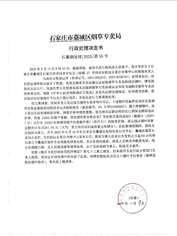 | 石藁烟处[2025]第56号 | 无主 | 无烟草专卖品准运证运输烟草专卖品 | 查获无主无烟草专卖品准运证运输烟草专卖品 | 《中华人民共和国烟草专卖法》第二十一条、《中华人民共和国烟草专卖法实施条例》第三十三条第二款 | 其他 | 《烟草专卖行政处罚程序规定》第七十三条之规定 | 公开销毁 | 2025年11月19日 | 行政处罚 | 石家庄市藁城区烟草专卖局 |