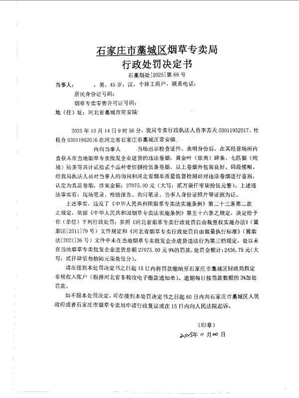 | 石藁烟处[2025]第69号 | 黄*军 | 未在当地烟草专卖批发企业进货 | 查获黄*军未在当地烟草专卖批发企业进货 | 《中华人民共和国烟草专卖法实施条例》第二十三条第二款 | 罚款 | 《河北省烟草专卖行政处罚自由裁量权实施办法》冀烟法【2011】79号文件及《河北省烟草专卖行政处罚自由裁量执行标准》冀烟法【2016】30号文件 | 罚款2436.75元 | 2025年11月20日 | 行政处罚 | 石家庄市藁城区烟草专卖局 |