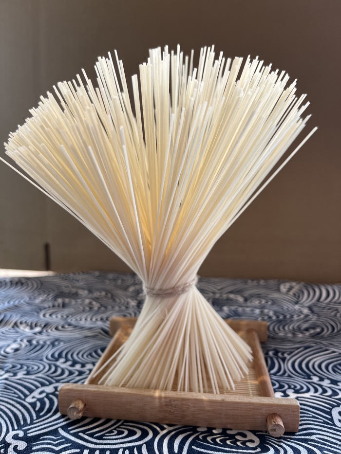 本品选用优质小麦粉、精炼植物油、精制盐为主要材料,经过十五道工序拉制而成。其特点条细如丝、空心如竹、易熟不糟、回锅不烂、柔韧爽口、营养丰富。历代皇帝选此面为宫廷御膳品,民国初期受南京总统府“国光”银牌嘉奖。