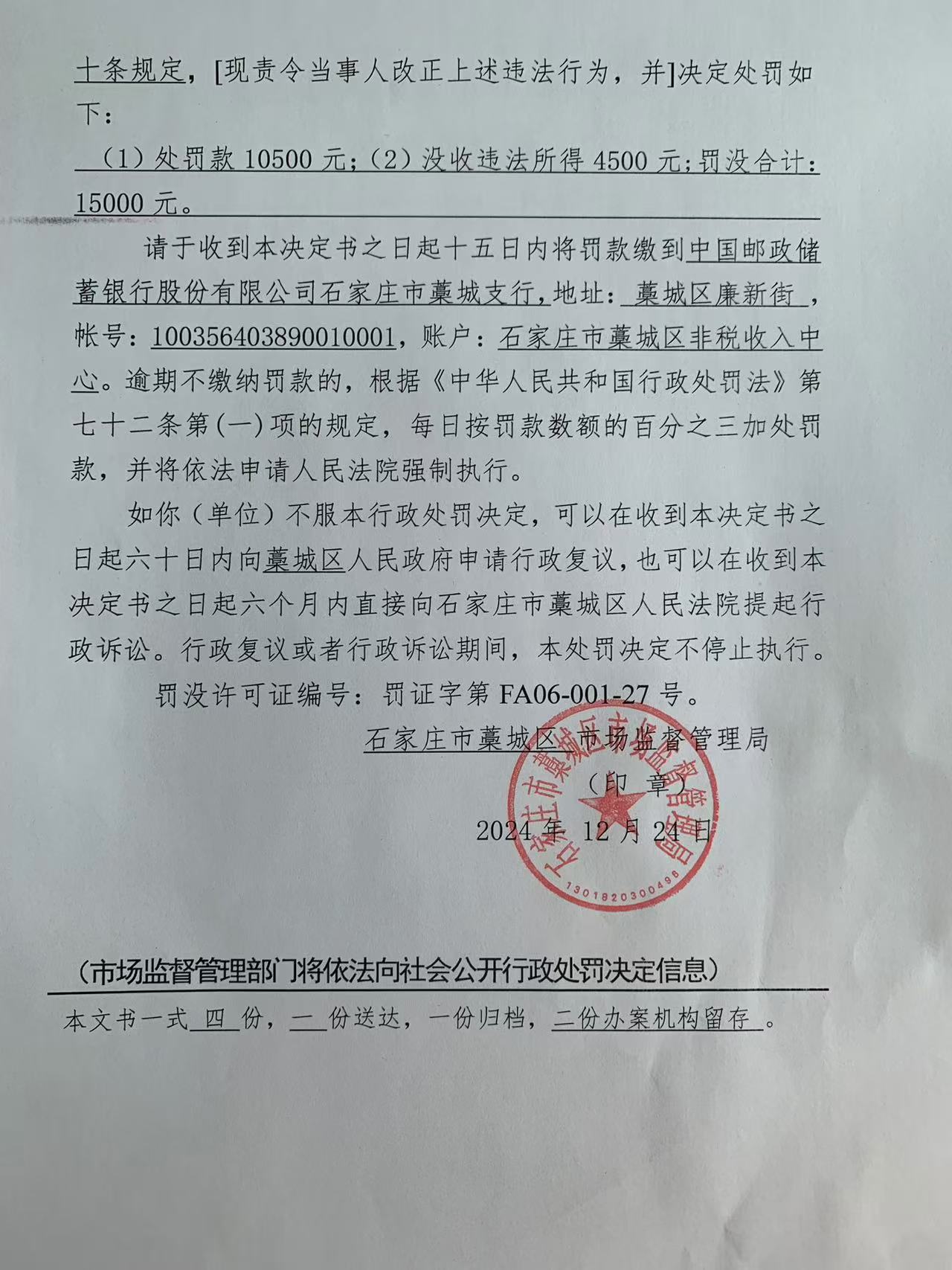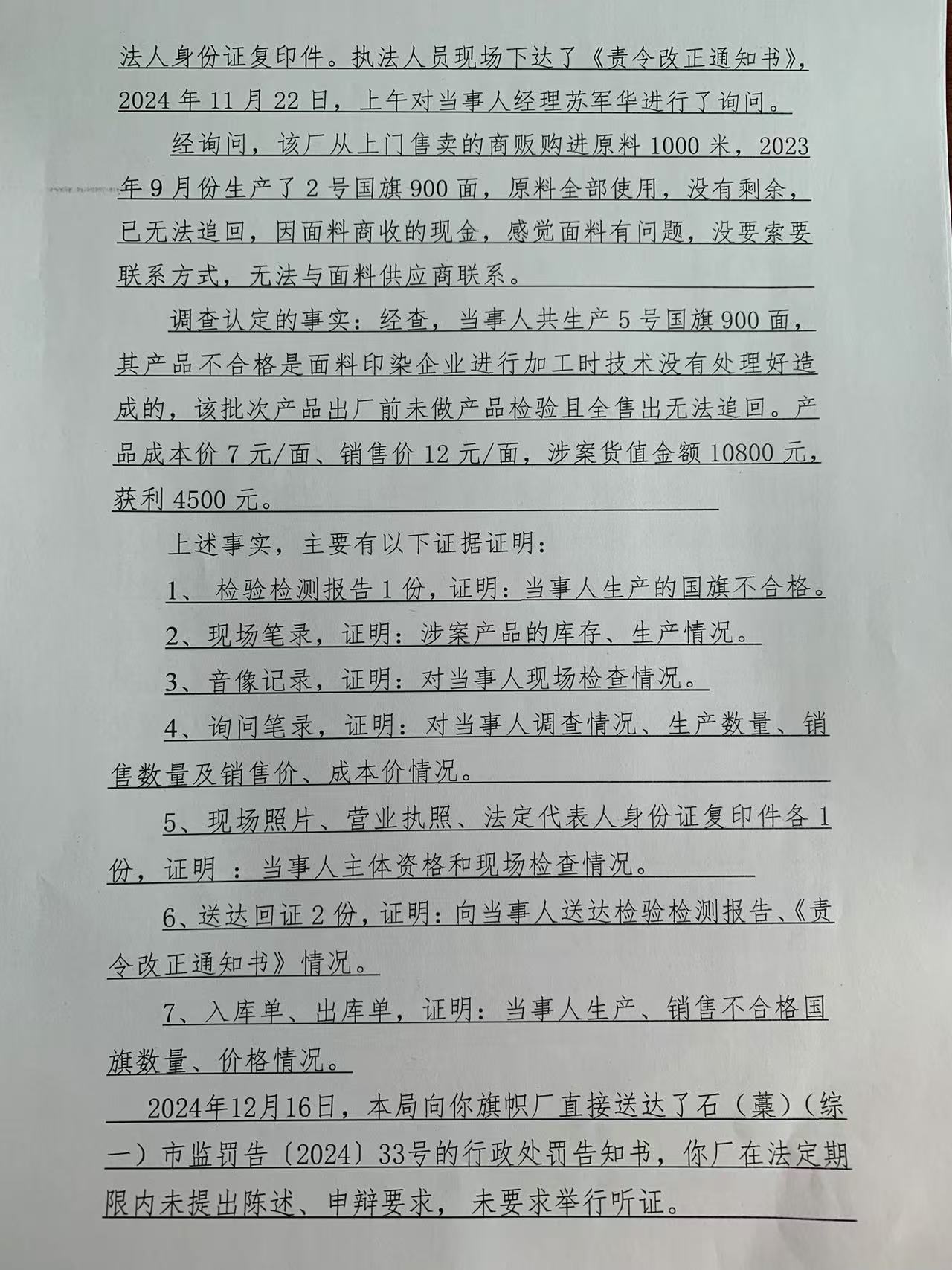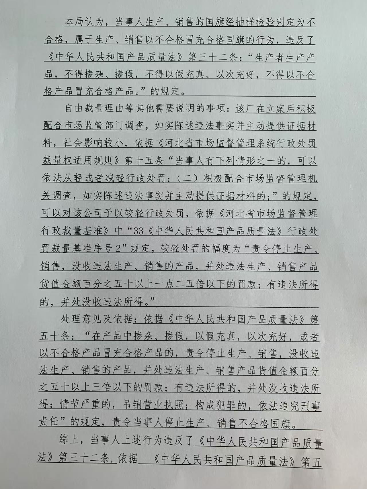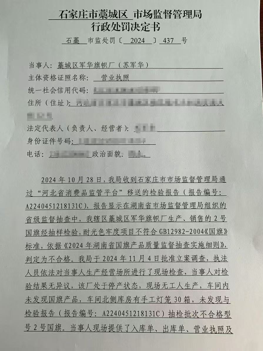藁城区军华旗帜厂(苏军华)生产销售以不合格冒充合格国旗案 石藁市监处罚【2024】437号