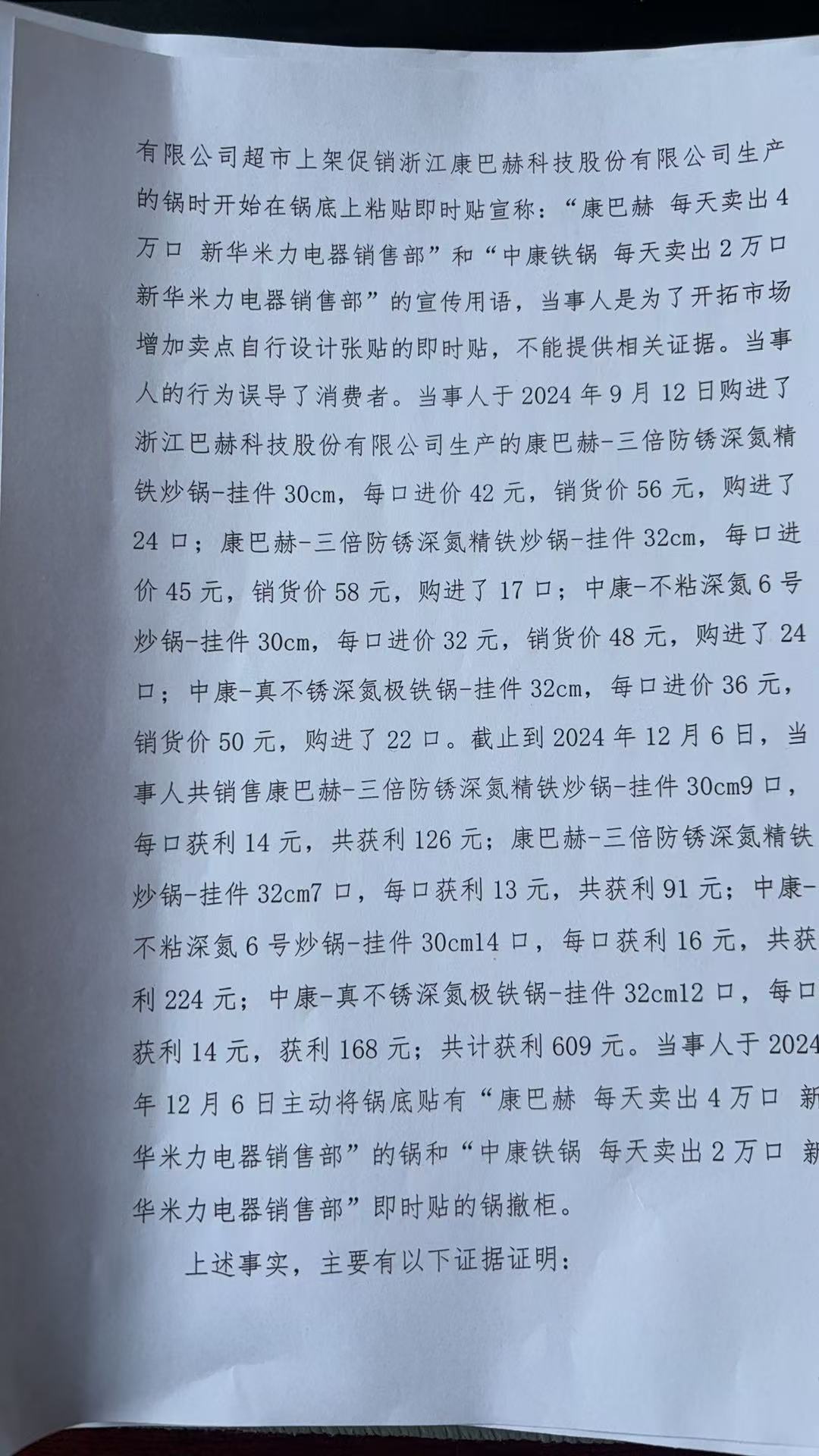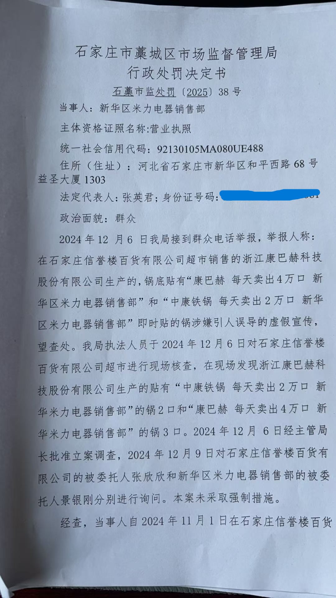 新华区米力电器销售部(张英君)涉嫌对康巴赫、中康铁锅作引人误解的商业宣传案 石藁市监处罚〔2025〕38号