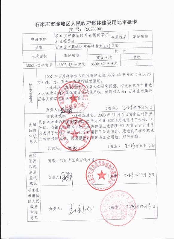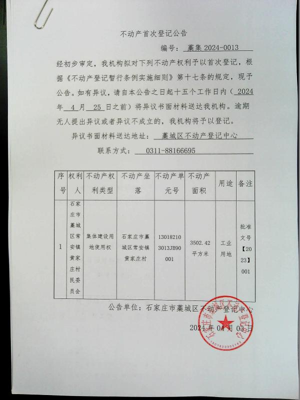 石家庄市藁城区常安镇黄家庄村集体建设用地使用权拟登记公告