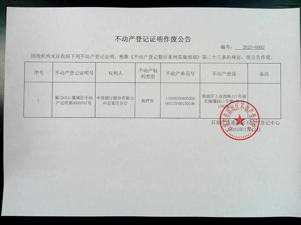不动产登记证明作废公告