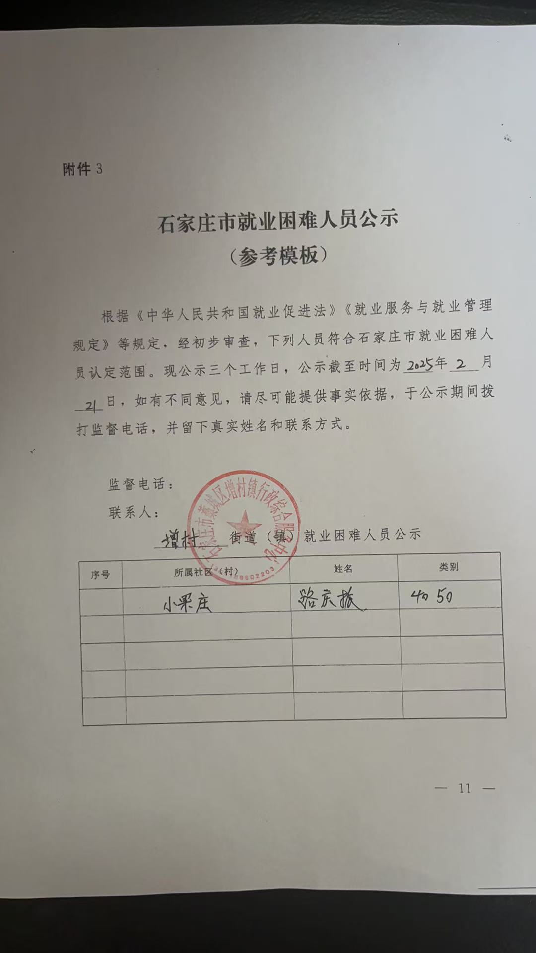 增村镇就业困难认定公示路庆振